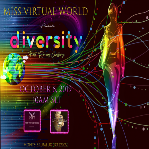 Rock Your Rack 2019 is happy to welcome the Miss Virtual World 2020 pageant to our event for their First Runway Challenge on Sunday, October 6, 2019 at 10am SLT. Come and see how the candidates styled around the theme of Celebrate Diversity using a minimum of 1 piece from the event in their styling. Arrive early! We are expected to fill the sim with this one on top of the event traffic. Please be sure to keep your complexity until 50,000 and keep all unnecessary huds and scripts off for this event. Thank you! This will be a the fashion show runway. From the landing point take the teleport to the fashion show venue.