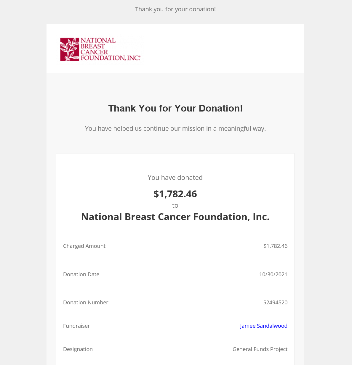 Second Donation has been made Posted by jameesandalwood in Uncategorized October 30, 2021 The second and final donation of the 1 million lindens raised in Second Life has been made. Here is the donation Receipt for that. Share this: Click to share on X (Opens in new window) X Click to share on Facebook (Opens in new window) Facebook Like Loading... Related